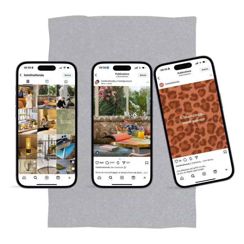 Nous accompagnons notre client depuis l’ouverture de son premier établissement, et avons poursuivi cette collaboration pour le lancement de son deuxième hôtel, L’Hôtel Inattendu, ouvert en juin. En charge de la gestion de ses réseaux sociaux, nous travaillons sur les textes et visuels, dans le but de diffuser l’image d’un hôtel singulier, loin des standards habituels.